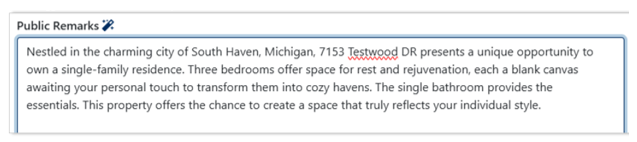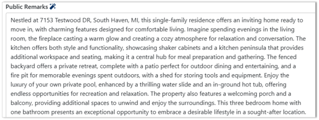 If the AI tools aren’t generating the type of content you expect—or are not accurately reflecting features shown in your photos—we’d love to hear from you. Please email us at support@realcomp.com and include the MLS number, property address, and a brief note on what the issue is so we understand how the AI tool needs to be improved upon.Thank you!