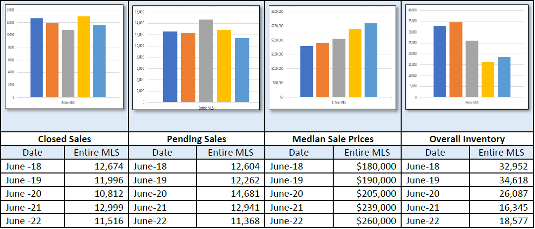The Median Sale Price for Wayne County passed the $200K threshold for the first time at $217,500, up by 17.6% over last June, based on 1,784 sales. Listings spent an average of 19 days on the market, down 3 days compared to last June.