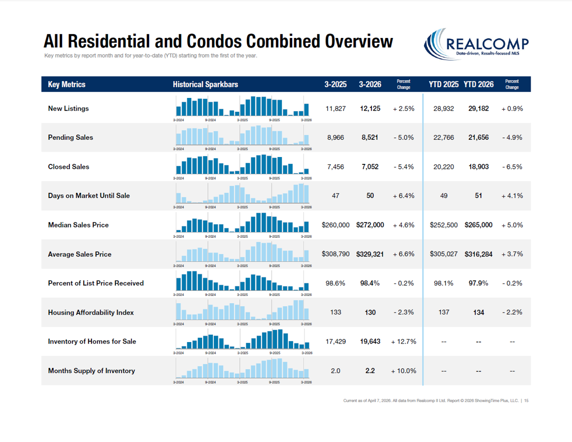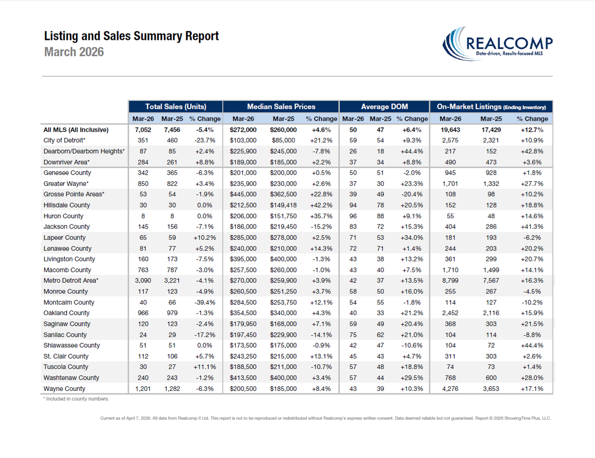 “While the market remains steady year-over year, we saw upticks from February to March 2026 in very significant categories,” said Karen Kage, CEO, Realcomp II Ltd. “With Spring upon us it appears both sales and pending sales are increasing. At the same time, an influx of new listings is providing more choices for prospective homebuyers.”